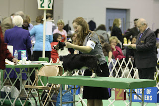 I was also quite blessed to have ringside praise about my girls. All three were given compliments ringside or out the ring about their movement, structure and/or temperament. To say I'm pleased in an understatement. And of course with the good, is the bad. Naked Naughties look tiny in comparison to bitches that have full coat and are larger. My girls are 27 pounds (the Naughties) and they looked like 12 week old puppies next to some of the bigger and more in coat bitches. I heard several comments about " I could never have a bitch that small" or something like that. But that's ok. I prefer them on the smaller side of the scale. They won't break down when herding or doing agility and they are slower to mature. I'm an impatient person so this drives me nuts to no end, but in the end is more rewarding.
